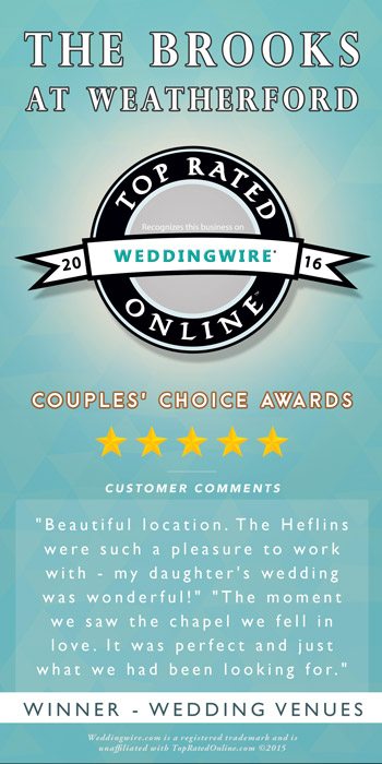 Known for commitment to excellence and unique design, Award winning Architect/Builder, Steve Heflin (steveheflinhomes.com) has captured classic elegance and rustic beauty in his design of the Brooks at Weatherford, creating an ideal setting for celebrating life’s significant moments and timeless events. Whether small or large event, wedding day or corporate gathering, The Brooks at Weatherford will prove to be a most beautiful place for your most special day.